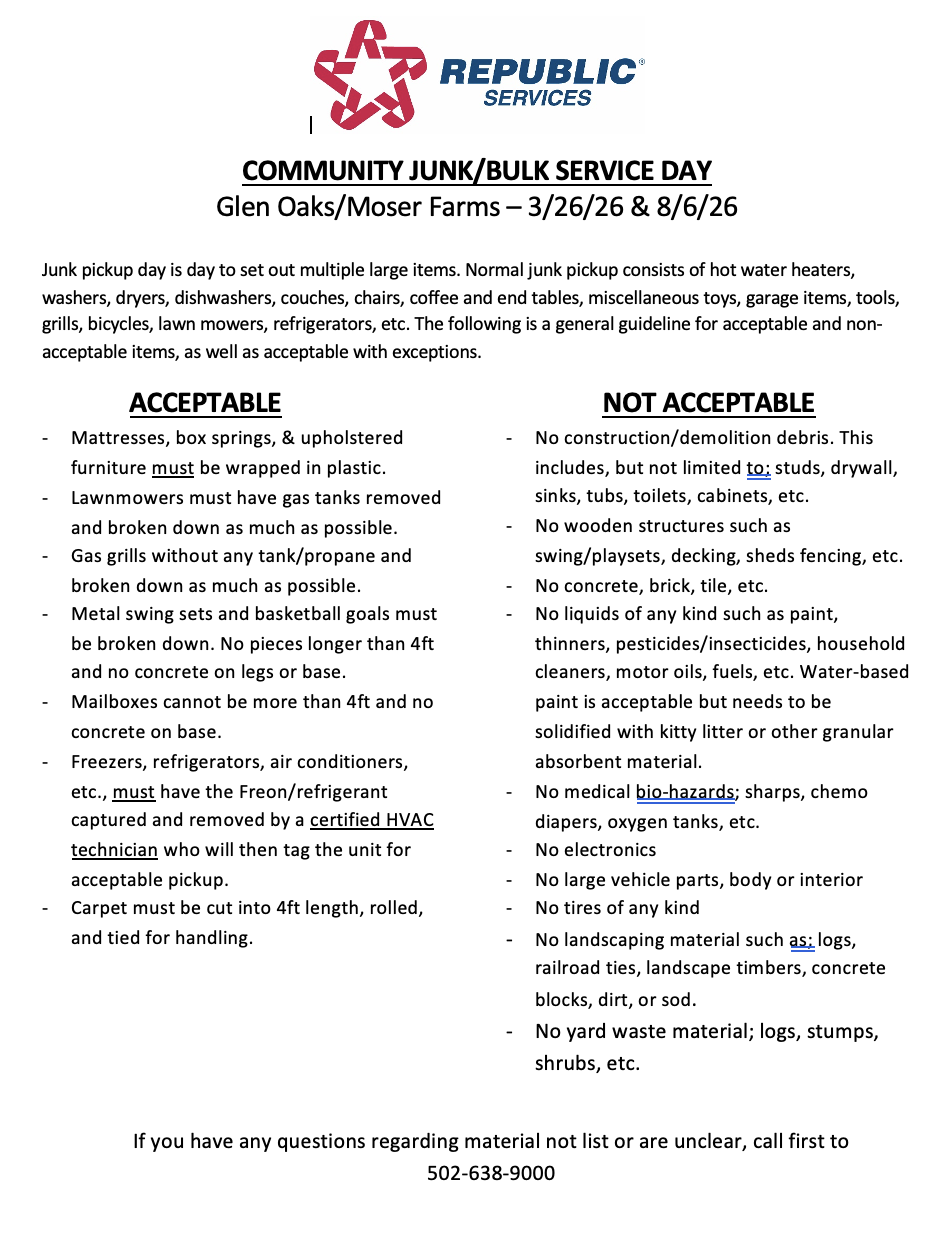 Junk pick up will be Thursday, August 6th. Please remember to place your items out the night before.